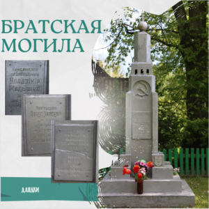 Установлен в 1959 г. в центре деревни. В память о 256 жителях деревни, заживо сожженных от рук немецко-фашистских захватчиков. Памятник – скульптурная композиция: воин, женщина с ребенком на руках и старик. На памятнике надпись: “Вас не скарылі не страхам не сілай. Помстам да ворага дыхаюць людзі. Спіце спакойна, родныя, мілыя. Вас не забудуць савецкія людзі”. Здесь захоронено 256 человек.