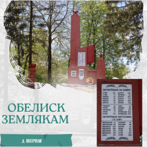 Установлен в 1967 г. в память о 182 земляках, погибших на фронтах, 6 в партизанской борьбе, 35 жителей, погибших в период немецко-фашистской оккупации. Установлено 6 стел с именами. Перед стелами – памятник Герою Советского Союза Н.Гастелло.