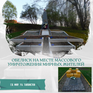 В 1966 году совхоз «Мирский» (теперь СПК «Мирский») установил фундаментальный памятник-обелиск. На памятнике имеется пятиконечная звезда и надпись: «Здесь в 1943 году были зверски расстреляны немецко-фашистскими захватчиками 750 человек мирных жителей г.п. Мир.