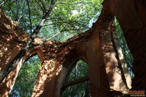 Конечный пункт — деревня Березовец. Руины Свято-Покровской церкви.  ДОТ и окопы.