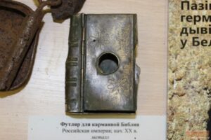 Один из наиболее интересных музейных предметов — полковой знак первой батареи седьмой Сибирской стрелковой артиллерийской бригады, найденный недалеко от агрогородка Луки. Среди редкостей также представлены ополченческий крест, который носили на фуражке, пряжка с ремня в форме двуглавого орла, нагрудный знак «За отличную стрельбу», мини-компас, простой карандаш в стреляной гильзе. Внимание привлекает металлический футляр для Библии.