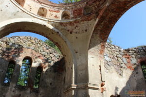 Конечный пункт — деревня Березовец. Руины Свято-Покровской церкви.  ДОТ и окопы.