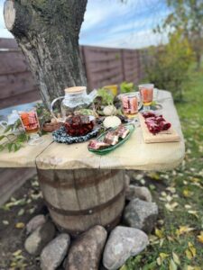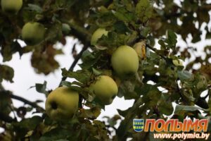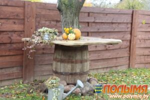 Каля плота расце старая вішня, абнятая драўлянай бочкай, зверху накрытай сталешніцай. На суседнім дрэве радуюць вока буйныя познія яблыкі.