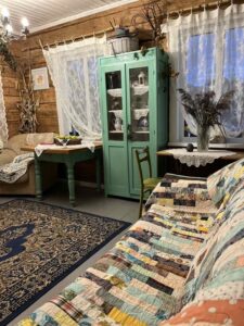 Пакуль разглядаю пакоі, гаспадары падрабязна расказваюць пра мэблю, расстаўленую вакол. У самым вялікім пакоі стаяць ложкі, канапа. Каля печы размясціўся доўгі куфар, знешне падобны на шафу, якую паклалі спаць каля цёплай сценкі.