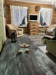 Заходзім у хату. У пакоях цёпла, паўсюль стаяць рознага кшталту ўпрыгожванні: рамкі, фігуркі, кветкі. На сценах развешаны зёлкі і вянкі, сплеценыя з галінак. На кухні завіхаецца гаспадыня Аксана, прыемна пахне гарбатай. Промні сонца гуляюць у рознакаляровых вітражах, якімі ўпрыгожаны дзверы паміж пакоямі.