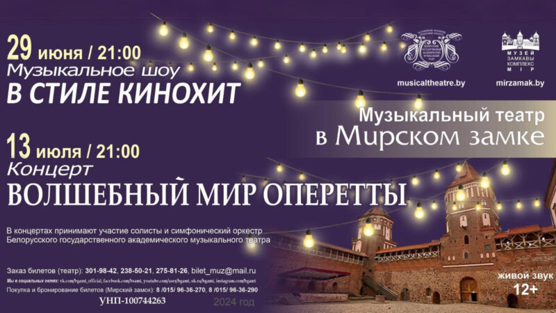 В рамках проекта «Музыкальный театр в Мирском замке» 29 июня, в прекрасный летний вечер, артисты и оркестр Белорусского государственного академического музыкального театра подарят своим зрителям незабываемую встречу с кинохитами.