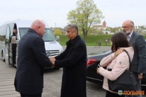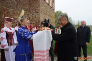 Высокого гостя поприветствовал председатель Кореличского райисполкома Андрей Гордей. По белорусской традиции его встретили хлебом-солью и народной песней.