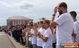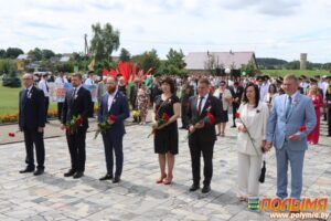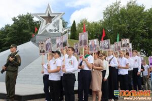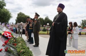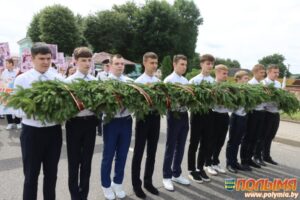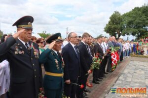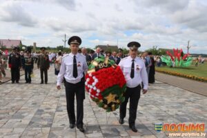 Гучаў метроном, чуўся трохразовы салют…Хвілінай маўчання прысутныя ўшанавалі памяць загінулых у гады Вялікай Айчыннай вайны, ветэранаў, якія не дажылі да гэтага дня. У памяць аб усіх, хто абараняў нашу свабоду і незалежнасць, хто падарыў нам сённяшні мірны дзень, удзельнікі мітынгу ўсклалі гірлянду, вянкі і кветкі да мемарыялу.