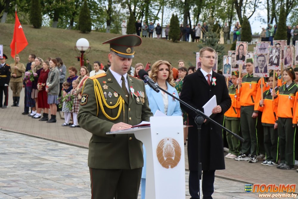 Начальнік абасобленай групы Карэліцкага раёна ваеннага камісарыята Навагрудскага і Карэліцкага раёнаў, маёр Яўгеній Гарлуковіч у сваёй прамове адзначыў, што ў нашай краіне ёсць шмат розных свят, і мы ўсведамляем іх значнасць і важнасць, паважаем і ўшаноўваем, але Дзень Перамогі выдзяляецца з усіх таму, што не было ў гісторыі чалавецтва больш лёсавызначальнай і трагічнай падзеі, чым Другая Сусветная вайна. Усё далей у мінулае адыходзяць падзеі Вялікай Айчыннай вайны, напоўненыя горам і пакутамі мільёнаў людзей, і ўсё менш застаецца тых, хто са зброяй у руках абараняў нашу Радзіму ў тыя суровыя гады. Ён заклікаў быць дастойнымі памяці людзей, якія прынеслі нам Вялікую Перамогу,  і назваў гэта святым абавязкам: памятаць і даражыць імі, вучыцца жыццю. «Моцная і квітнеючая Беларусь — лепшая падзяка ад нашчадкаў загінулым і жывым, тым, хто ў жорсткай барацьбе адстаяў незалежнасць нашай краіны», — падкрэсліў прамоўца.