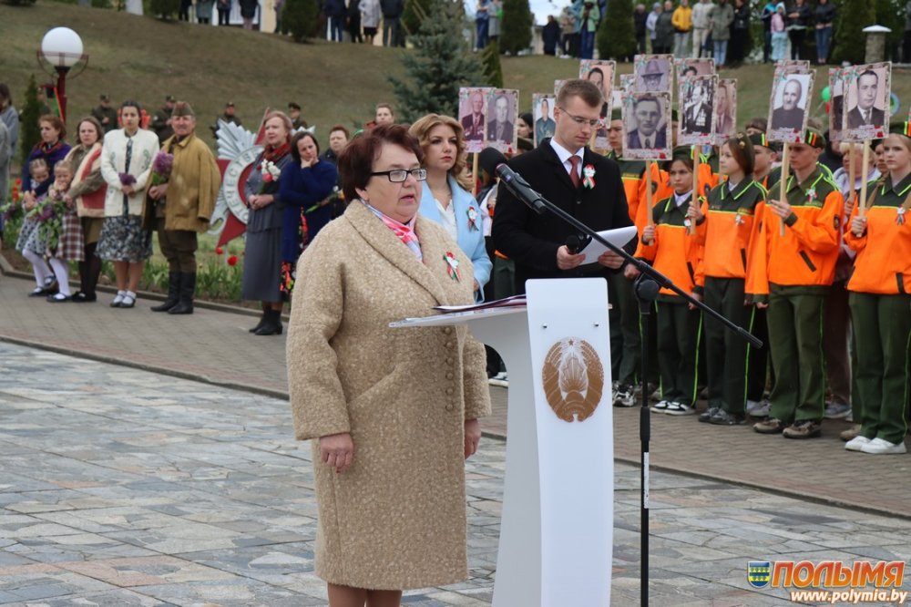 — Дарагія землякі, ветэраны Вялікай Айчыннай вайны, працаўнікі тылу і дзеці вайны! Прыміце самыя шчырыя віншаванні з Днём Вялікай Перамогі! Сёння мы сабраліся, каб адсвяткаваць велічную дату — 80-годдзе Перамогі савецкага народа ў Вялікай Айчыннай вайне. Вялікая Айчынная вайна — гэта не толькі старонка гісторыі, гэта жывы напамін аб цане, якую прыйшлося заплаціць за свабоду і незалежнасць нашай Радзімы. Прайшло ўжо шмат гадоў, аднак наступствы той вайны напамінаюць аб сабе і сёння. Скаверкаваныя лёсы людзей, пажоўклыя пахаронкі амаль у кожнай сям’і. Выбітае з жыцця цэлае пакаленне маладых людзей. Рэспубліку Беларусь ніколі не зразумець, калі не ведаць, што ж перажыў наш народ падчас вайны. Які ён набыў вопыт на фронце і ў тылу. Не зразумець нашы асаблівыя адносіны да арміі абаронцаў Айчыны.