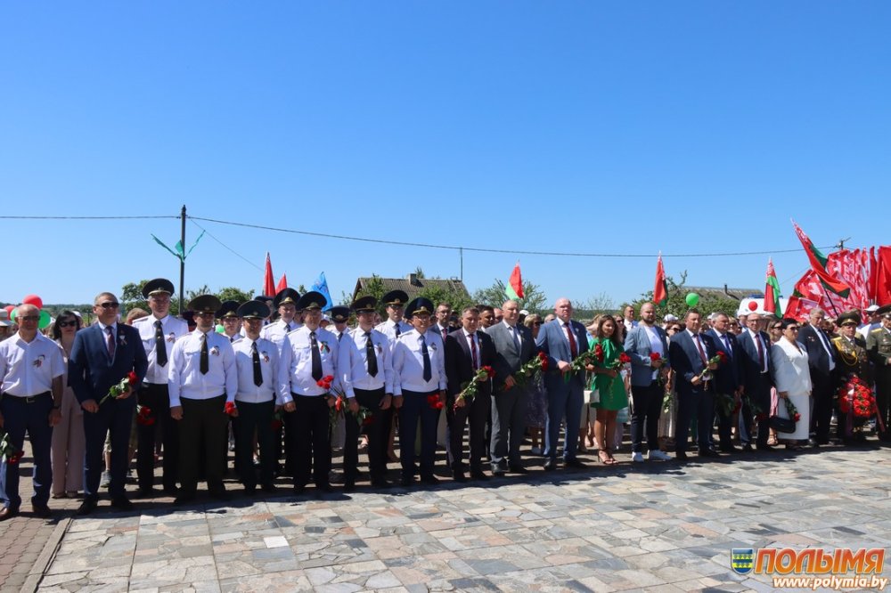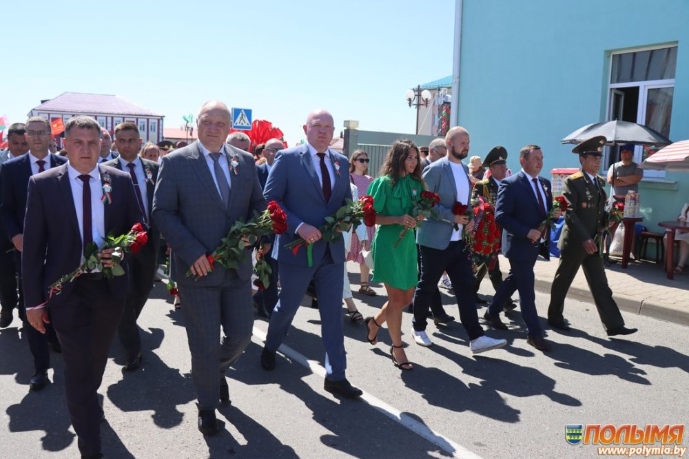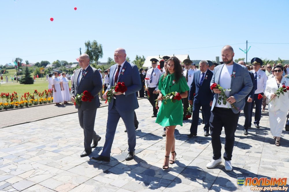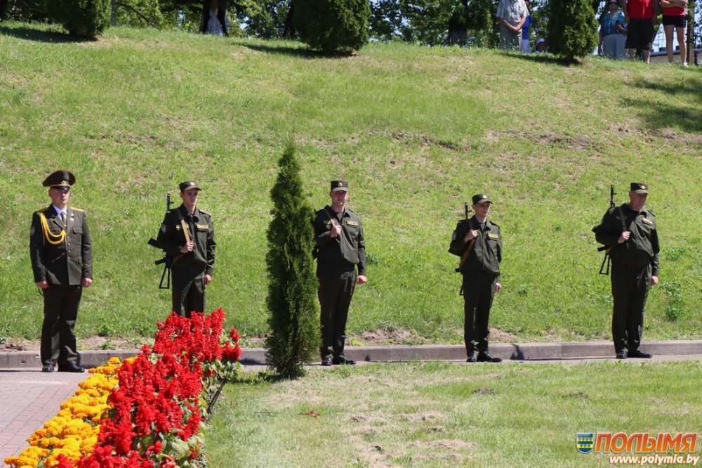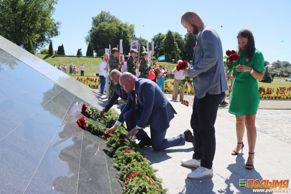 Прысутныя ўшанавалі хвілінай маўчання памяць усіх, дзякуючы каму мы сёння жывём пад мірным небам. І толькі залпы салюту перапынілі цішыню, якая ўсталявалася над наваколлем. Удзельнікі ўрачыстасці ўсклалі гірлянду, вянкі і кветкі да падножжа мемарыялу.