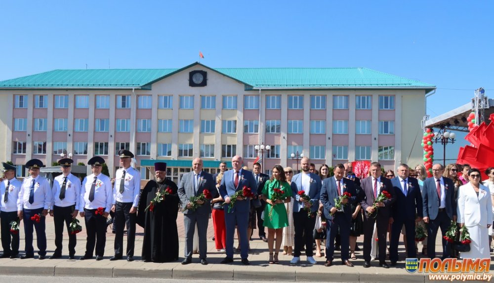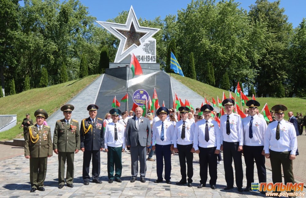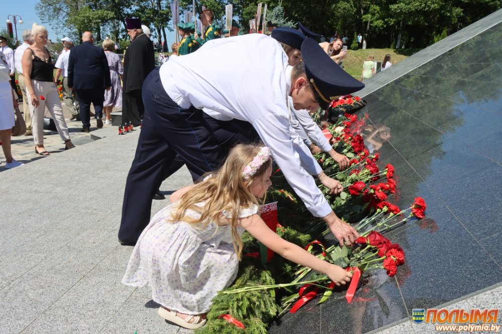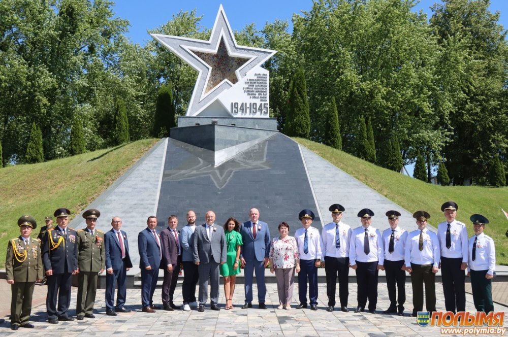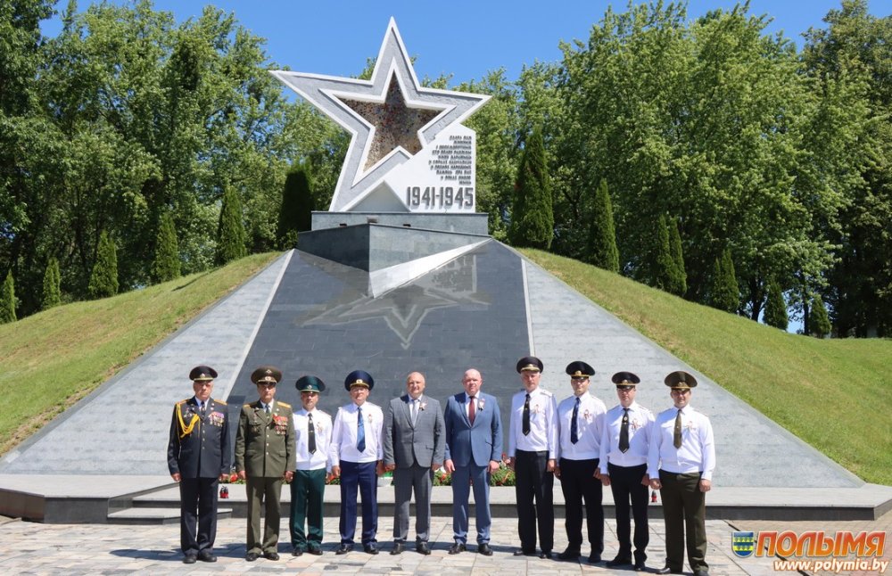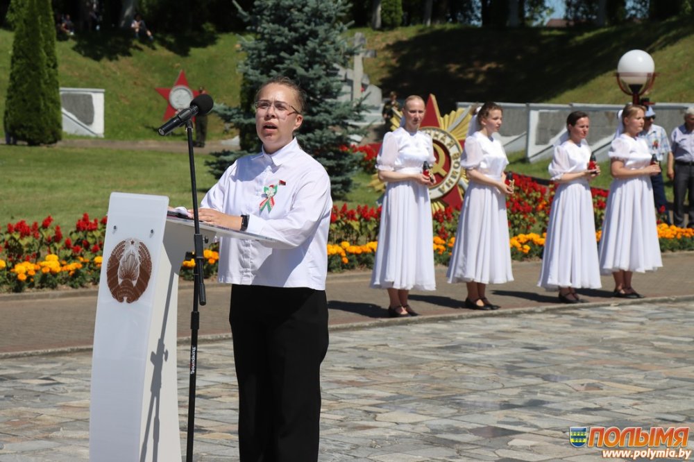 Прысутныя ўшанавалі хвілінай маўчання памяць усіх, дзякуючы каму мы сёння жывём пад мірным небам. І толькі залпы салюту перапынілі цішыню, якая ўсталявалася над наваколлем. Удзельнікі ўрачыстасці ўсклалі гірлянду, вянкі і кветкі да падножжа мемарыялу.